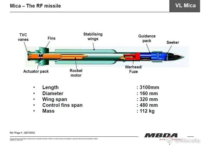 然而轻量化设计也影响了导弹动力性能。米卡固体火箭发动机燃料段仅长约1200毫米,比怪蛇3的发动机还要短。两者弹径相同,怪蛇3发动机总冲约8500千克,米卡则只有约7200千克。表征导弹动力特性的总冲质量比只有65,比其他第三代中距空空弹都要低(AIM-120A和R-77都达到80到85的水平)。
