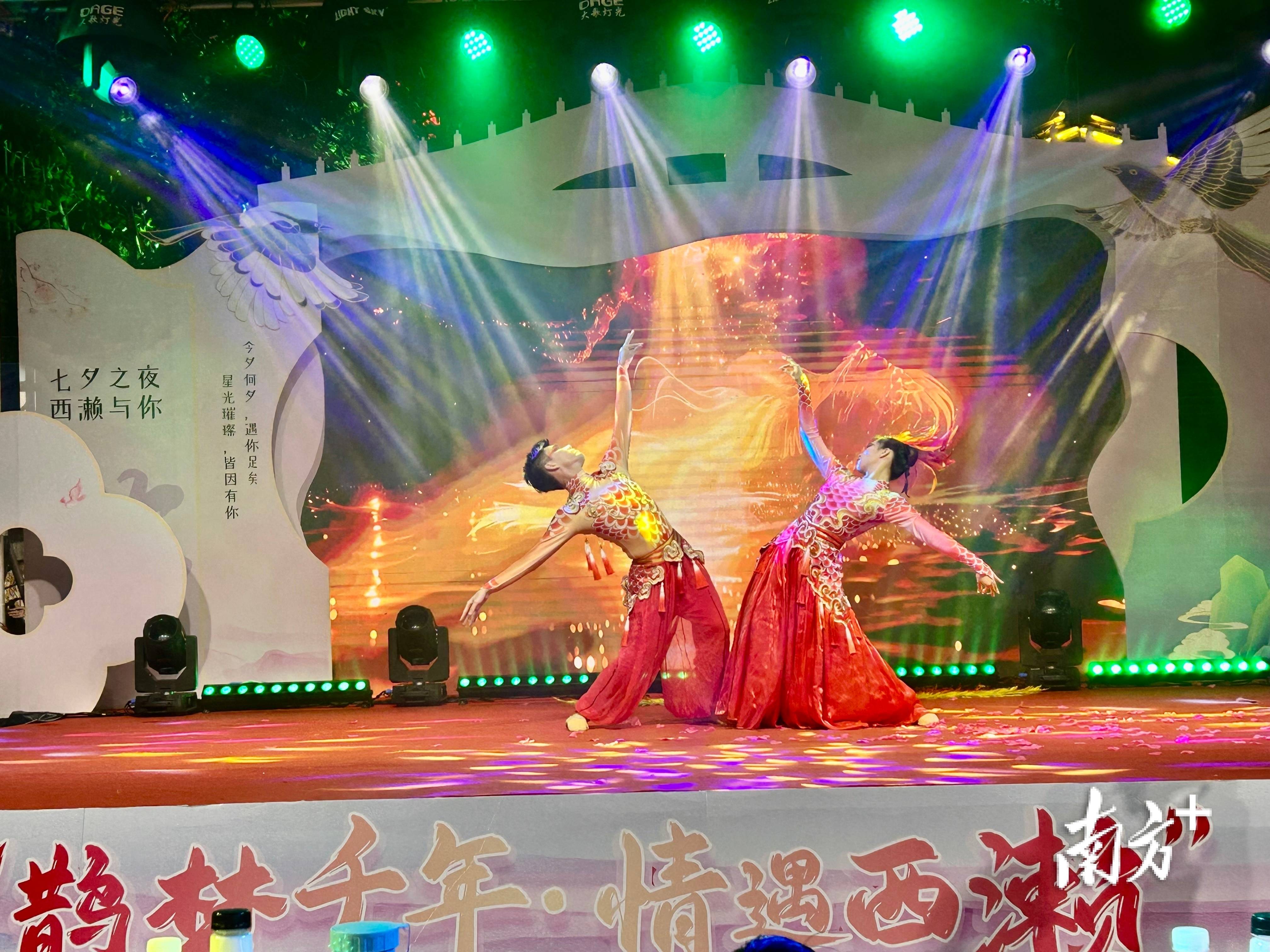晚上7时半,在西濑风情景区一号公园首先登场的“抛绣球说媒”相亲活动瞬间点燃现场气氛。三位媒婆登台主持,复刻古代“绣球定姻缘”民俗,现场单身男女踊跃参与,在欢笑中感受七夕“牵红线”的甜蜜,赢得现场阵阵欢呼声。