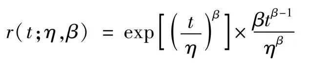 这里,故障率函数r(t)可以看作两个函数r1(t; η, β)和r2(t; η, β)的乘积。其中,当β<1时,r1为减函数,而r2则总是增函数。
