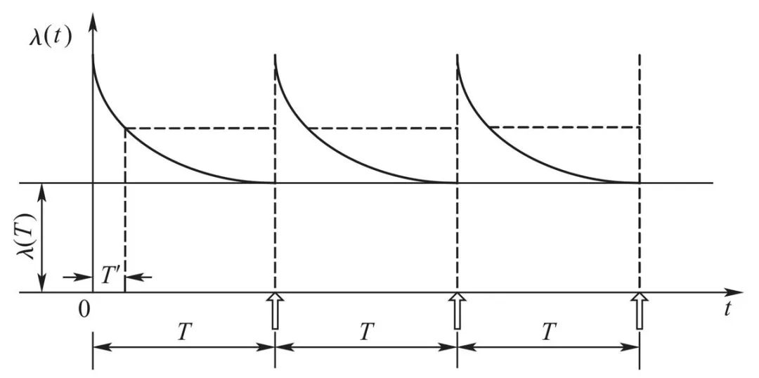 图3表示每相隔间隔期T实行定时更换时故障率的变化情况。每次定时更换,都会使故障率升高,并使平均故障率大于λ(T),保持在相对较高的水平。
